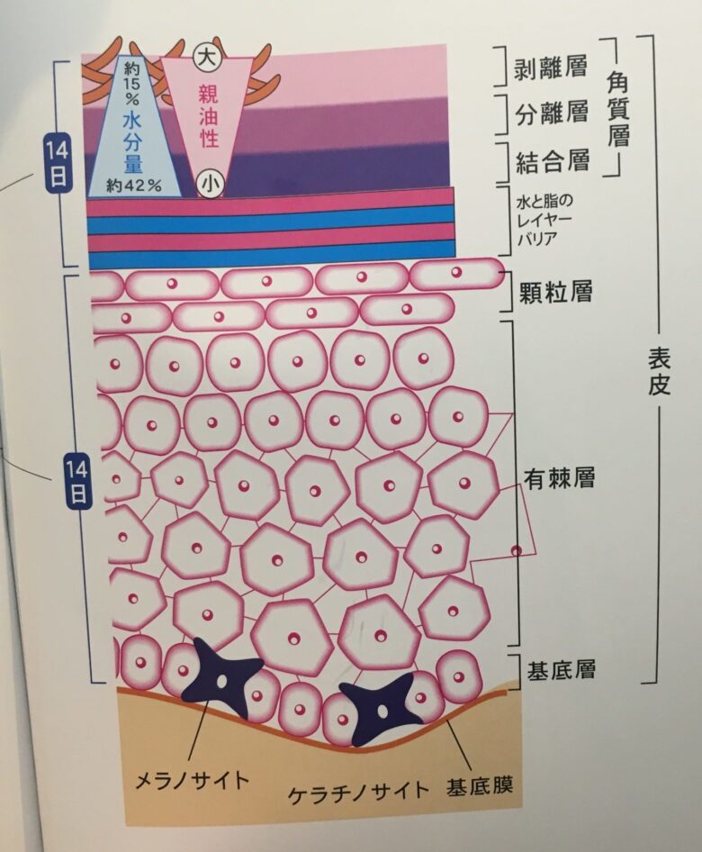 基底層から顆粒層まで約14日、角質層で角質が完成するまで約14日、計28日サイクルです!!