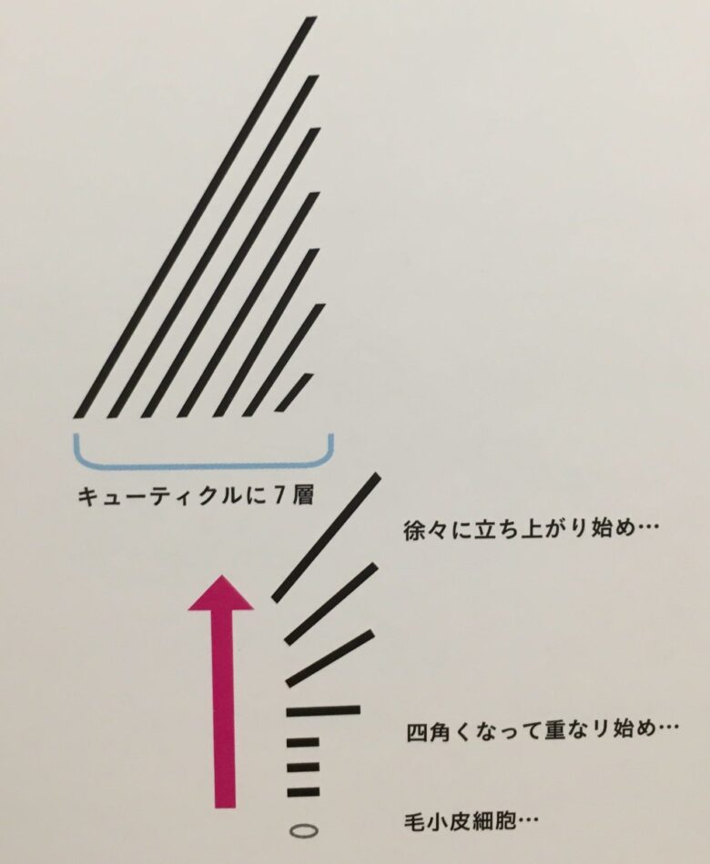 キューティクルを形成する毛小皮細胞は、ひとつずつ上昇して徐々長方形になり、毛球の上部で表皮と水平方向にひとつずつ重なる状態になります。